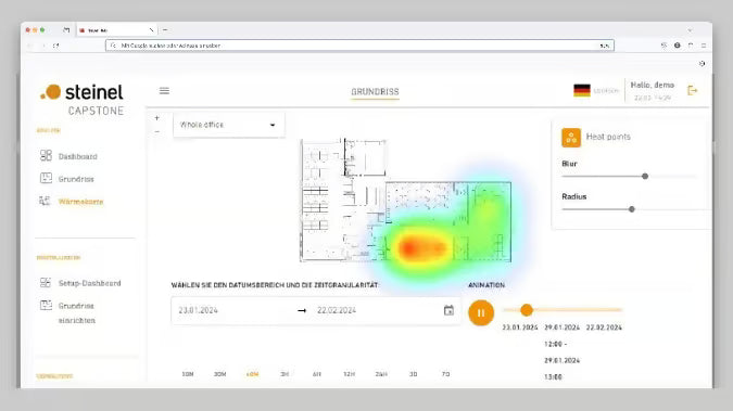 With the new Capstone® software solution, it is now possible for the first time to recognise and visualise all IP and Bluetooth sensors and lights in the network. This provides a complete overview of the building status: temperature, humidity, CO2, VOC, noise, smoke, presence, brightness and number of people. Based on the analysed data, optimisation suggestions for better space utilisation can then be created.