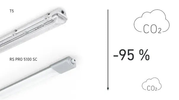 STEINEL LED modules provide a very long lighting period of up to 30,000 hours and consume little power. However, minimal consumption is only possible when sensors and networking are used. Thanks to intelligent light control, energy and CO2 consumption can be reduced by up to 95% compared to conventional T8 lights.