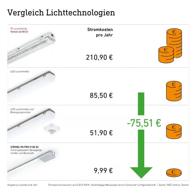 A direct comparison of the CO2 values shows that our LED luminaire "RS PRO 5100 LED SC" has by far the smallest ecological footprint. The emissions of our sensor-controlled LED luminaire are 20 timeslower1 than those of a conventional T8 fluorescent tube and save more than €200 in electricity costs per luminaire per year. But switching from an LED light without a sensor to one with one also saves 141 kg of CO2 and €75.51 in electricity costs per year. By the way: the CO2 emitted during production is offset after just 40 days of using the "RS PRO 5100 LED SC"!2