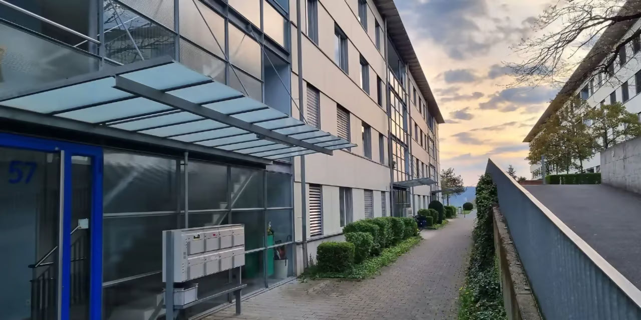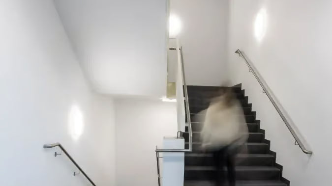Perfectly connected lighting: the warm white light of the R series creates a pleasant atmosphere in the Rütihof residential cooperative in Zurich-Höngg. Thanks to swarm intelligence, the light accompanies residents through the stairwell and also drives massive energy savings.
