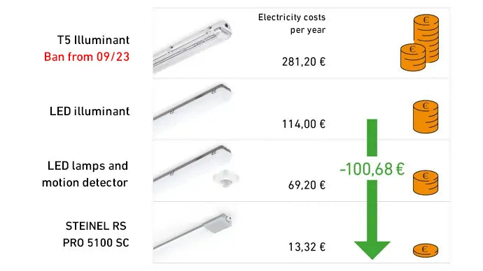 With the RS PRO 5100 SC, a huge amount of CO2 can be saved compared to a T5 light source, which in turn leads to cost savings of over €100 per light fitting.